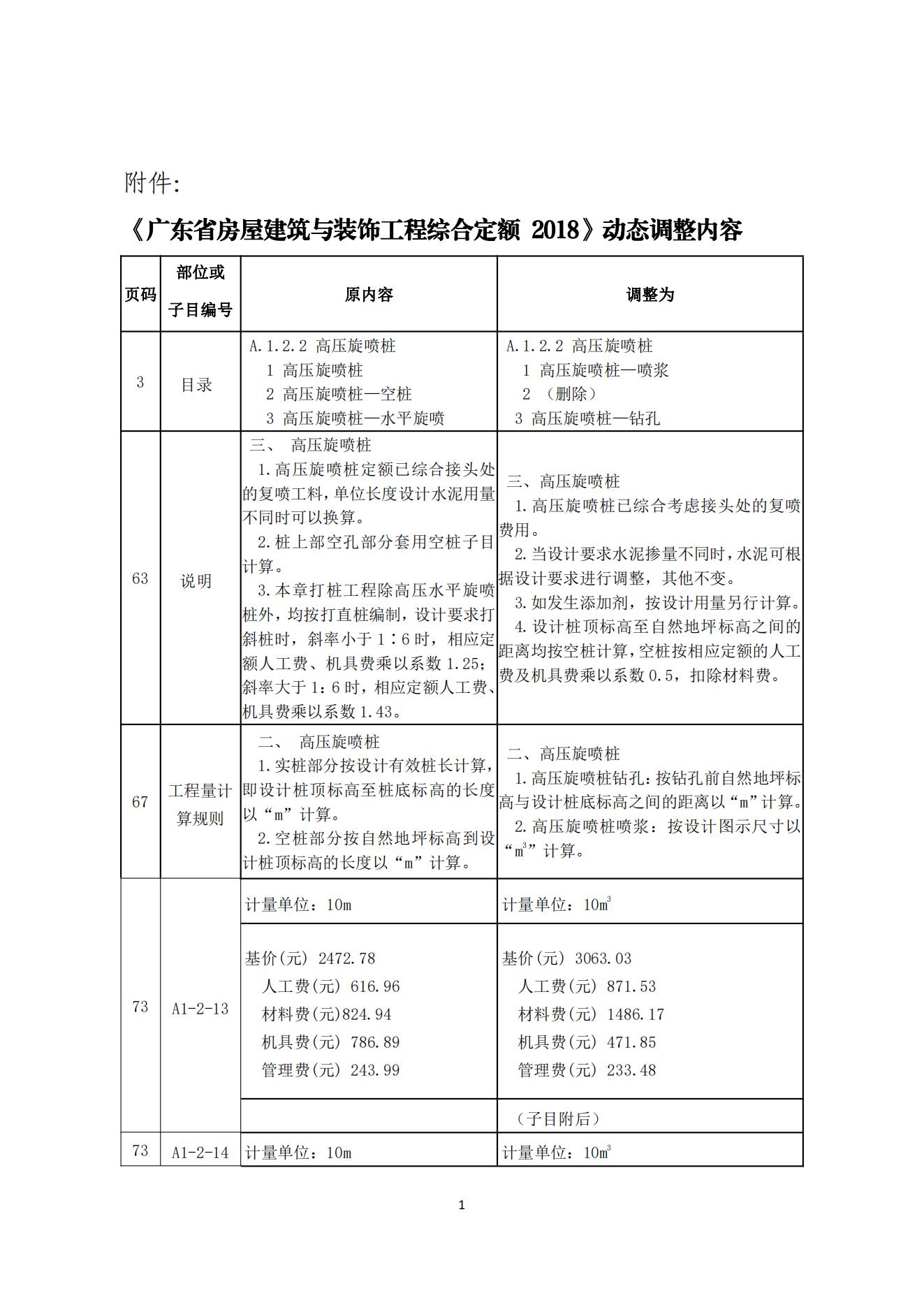 近期,我站组织专家研析了广东省建设工程定额动态管理系统收集的反馈意见,现将《广东省房屋建筑与装饰工程综合定额 2018》高压旋喷桩子目调整内容印发你们。本调整内容与我省现行工程计价依据配套使用,除合同另有约定外,已经合同双方确认的工程造价成果文件不作调整,请遵照执行。执行中遇到的问题,请通过“广东省工程造价信息化平台——建设工程定额动态管理系统”及时反映。